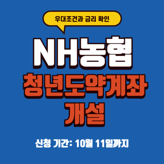 NH농협은행 청년도약계좌는 안정적인 금리와 다양한 우대 조건을 갖춘 상품입니다. 급여 이체와 카드 실적 등을 통해 추가 금리 혜택을 받을 수 있으며, 예금 담보 대출을 통해 유동성을 확보할 수 있습니다. 해당 상품은 2024년 10월 31일까지 가입절차를 진행하고, 11일까지 신청을 받습니다!