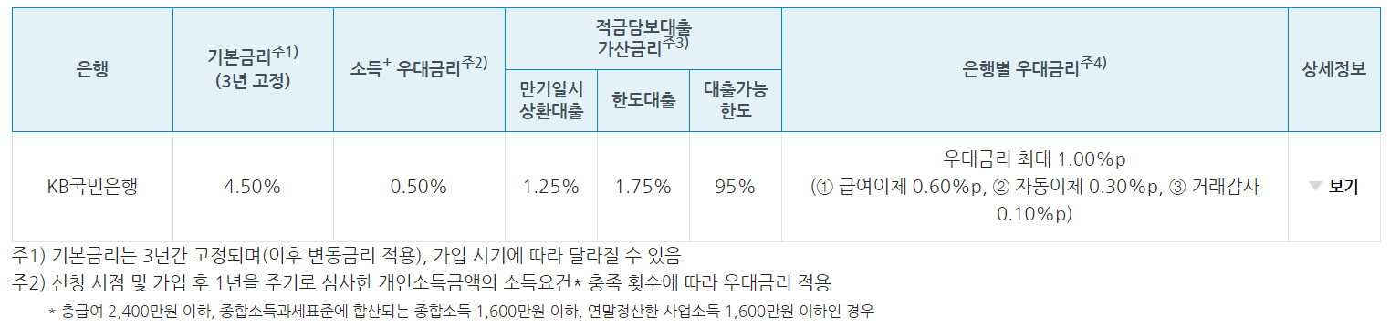 소득 + 우대 금리: 가입 시 및 매년 소득 검토를 통해 금리가 적용되며, 소득 요건을 충족한 횟수에 따라 금리 혜택이 달라집니다.